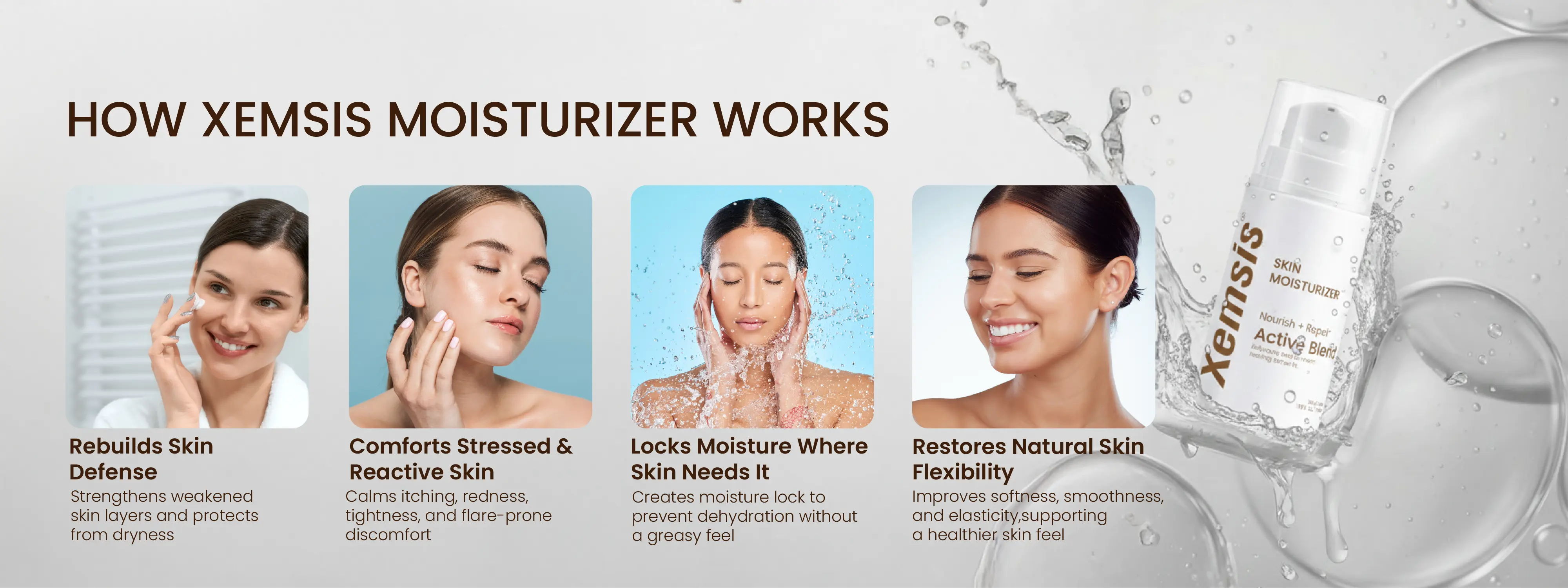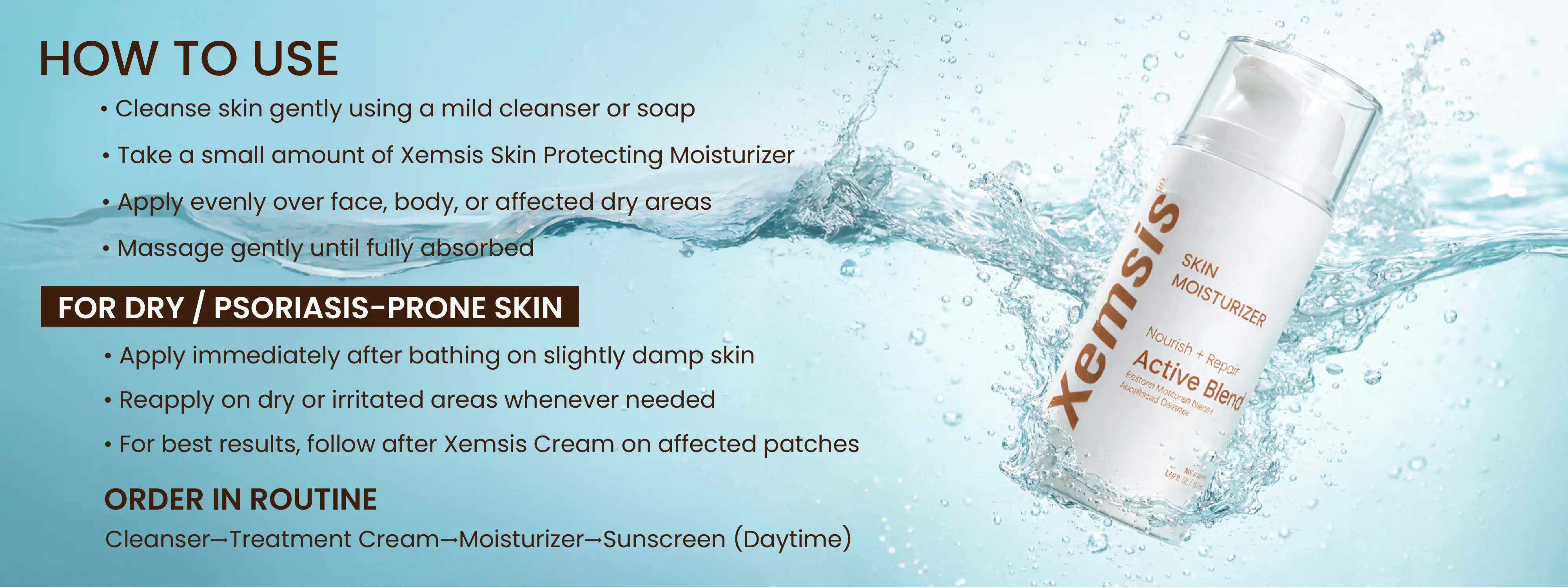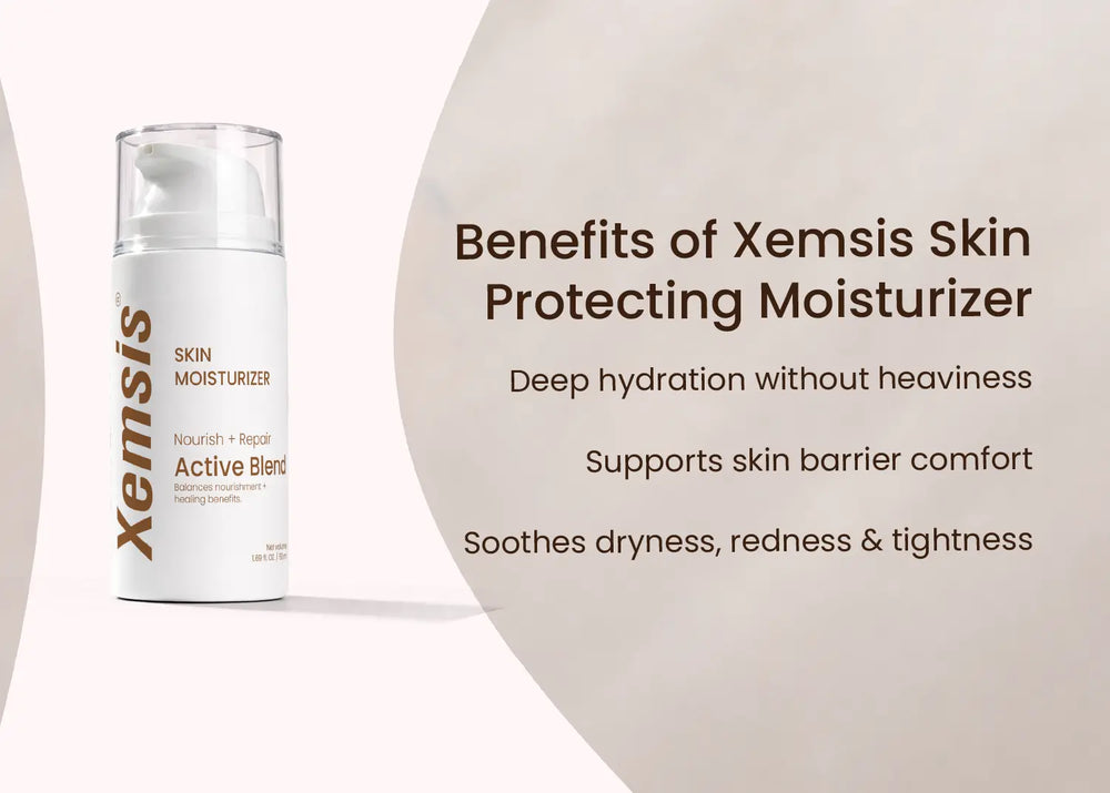 Xemsis Moisturizer helps soothe dry, irritated, and redness-prone skin by supporting the skin’s natural comfort response, making it suitable for sensitive and psoriasis-prone skin.