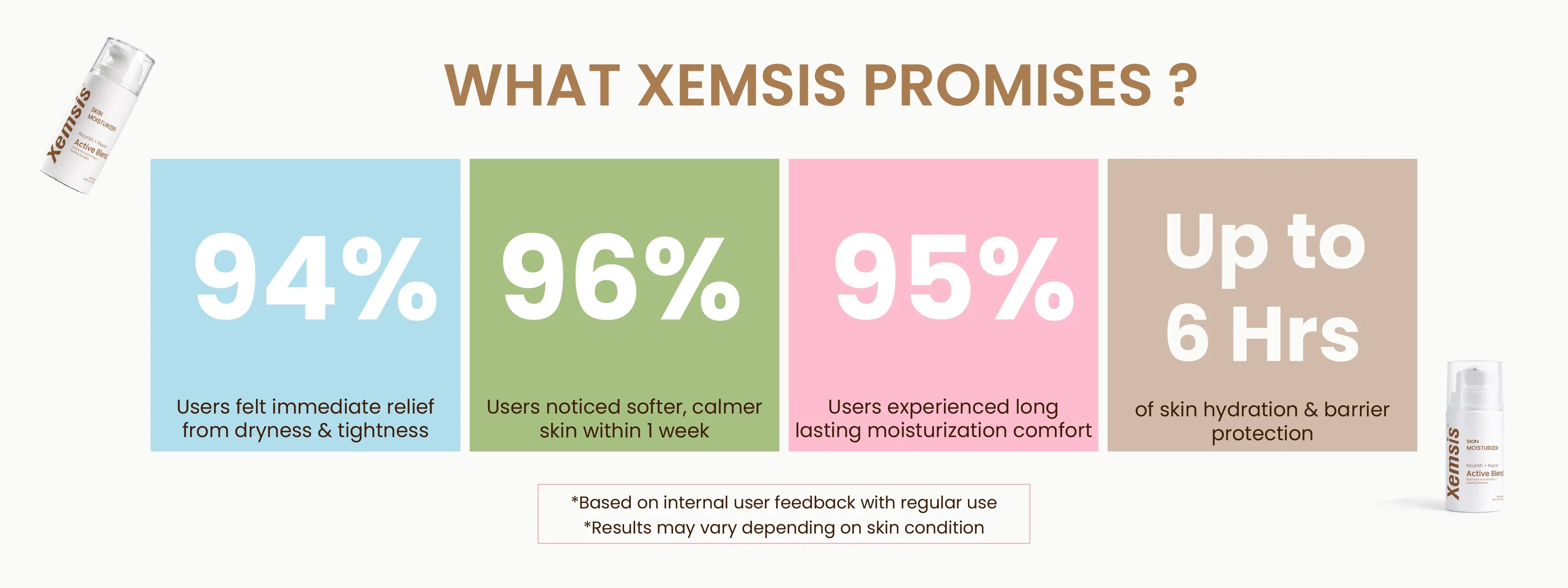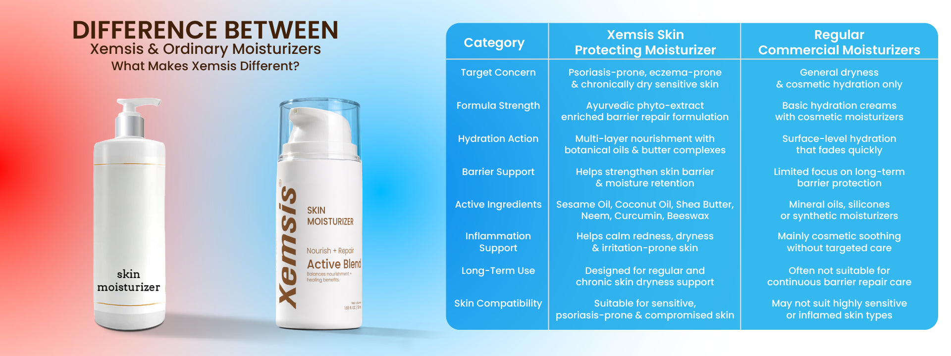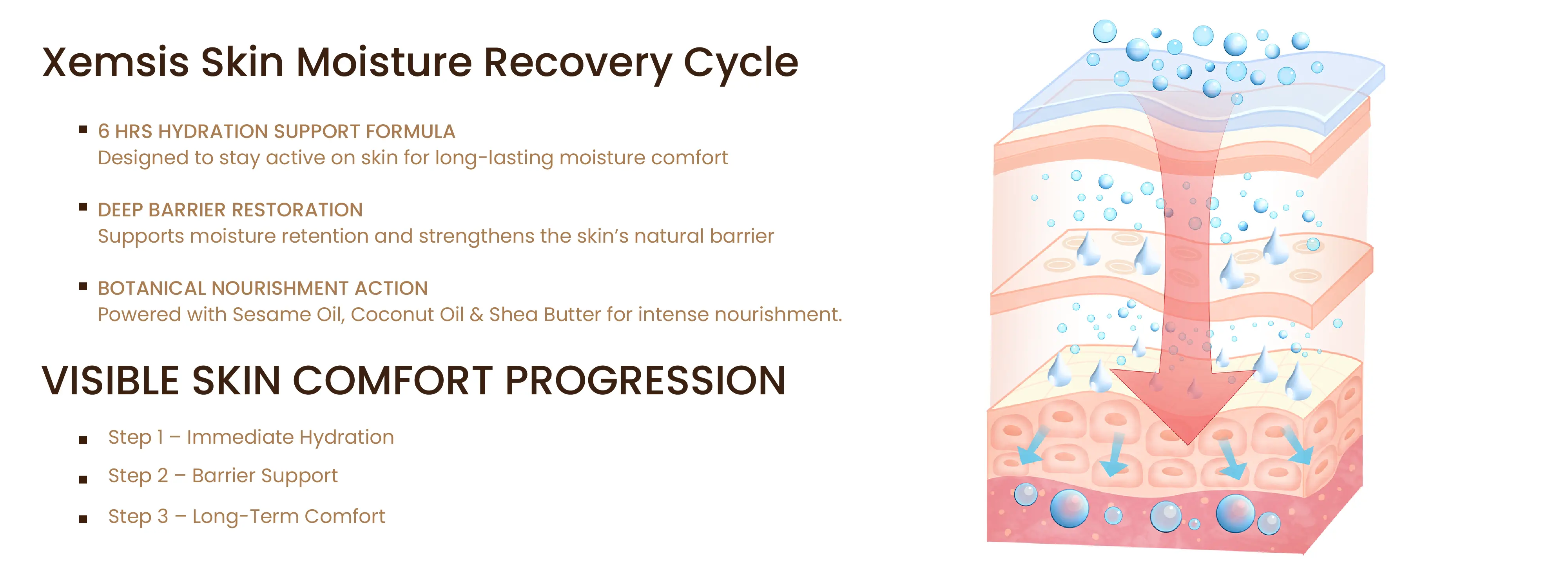 Xemsis Moisturizer helps soothe dry, irritated, and redness-prone skin by supporting the skin’s natural comfort response, making it suitable for sensitive and psoriasis-prone skin.