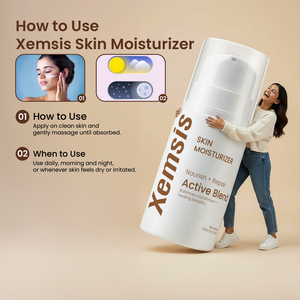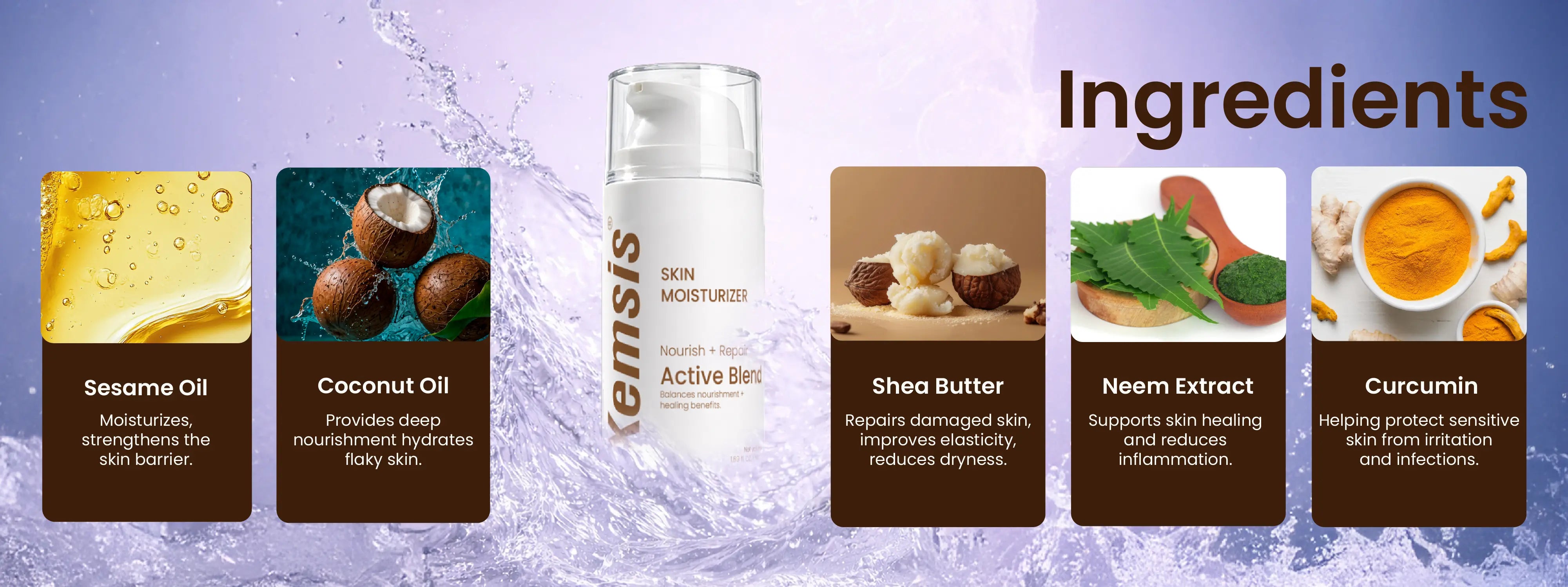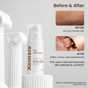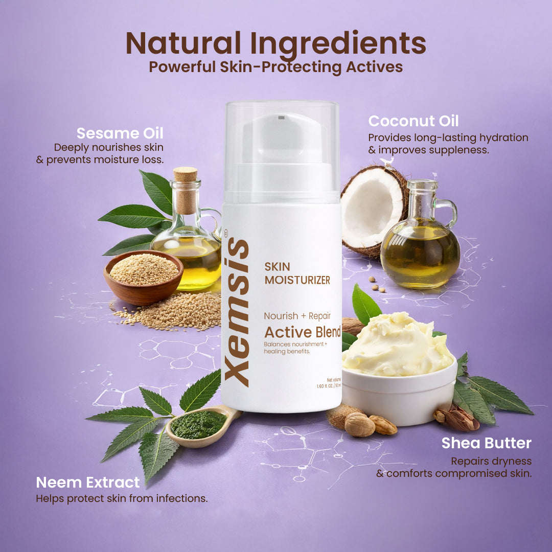 Xemsis Skin Moisturizer is thoughtfully formulated as a best moisturiser for dry sensitive skin, offering long-lasting comfort without heaviness. Enriched with sesame oil, coconut oil, shea butter, neem, and curcumin, it helps calm irritation, support skin barrier health, and reduce visible dryness. Ideal as a good moisturiser for psoriasis and moisturizer for flaky skin, it nourishes deeply, soothes discomfort, and helps maintain soft, resilient skin with regular use.